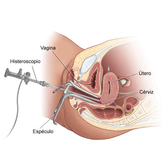Exploración. Se requiere que la paciente este en posición ginecológica. Una vez que se ha verificado el correcto funcionamiento del equipo, con el histeroscopio vía vaginal identificamos el orificio cervical interno, el cual se debe atravesarlo lo más cuidadosamente posible. Una vez en la cavidad uterina, se recomienda esperar unos instantes, para que ésta se distienda